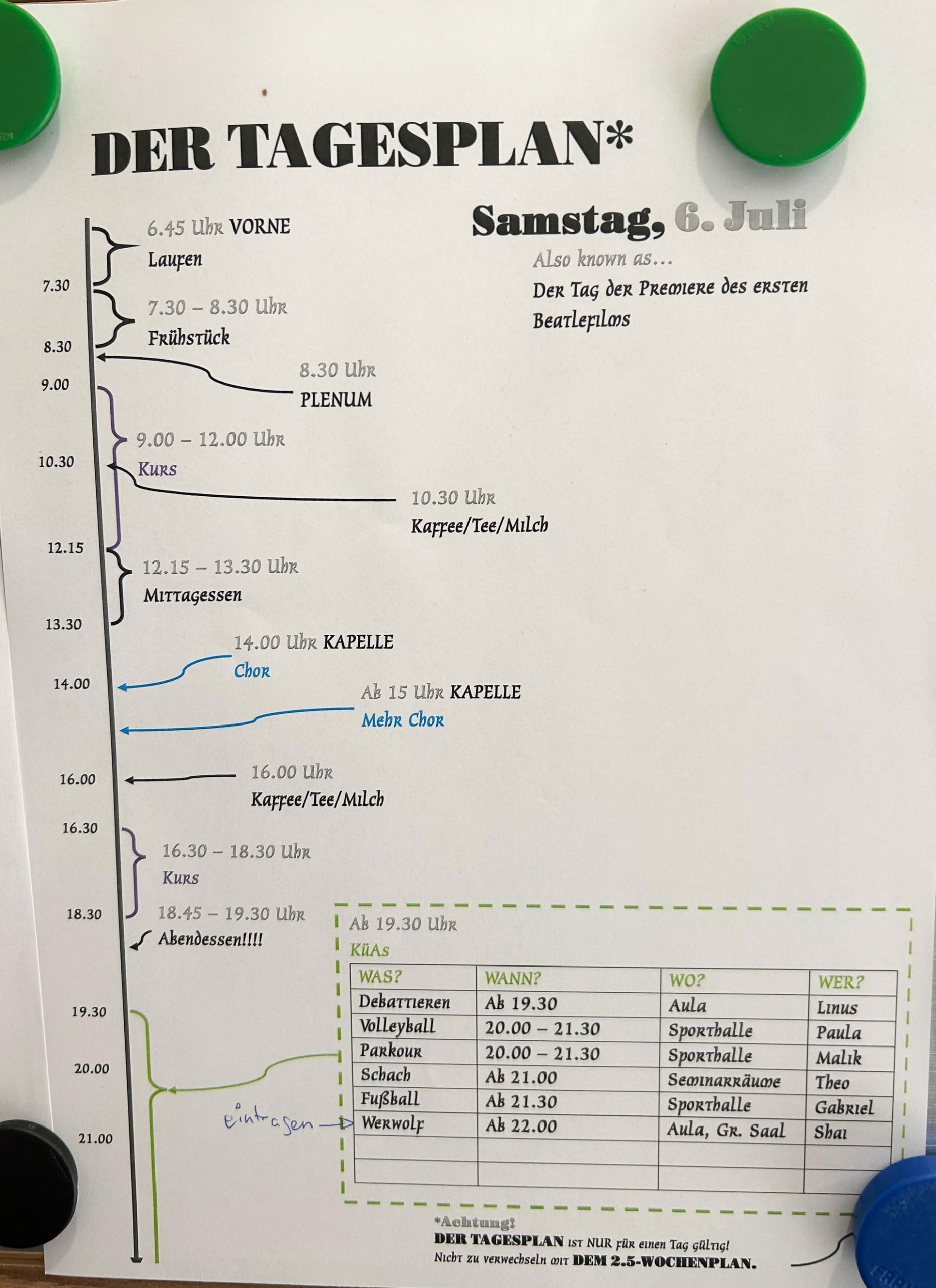 Zusätzlich hatte man den Großteil des Nachmittags und den ganzen Abend frei. Die Zeit konnte sich jeder individuell einteilen. Es gab viele Musikangebote, Sportkurse und am Abend wurde immer Werwolf gespielt. Dabei sind alle Angebote, bis auf die Musik, von uns Teilnehmern organisiert worden. Am Ende der Akademie wurde auch ein selbstorganisiertes Schachtunier veranstaltet.